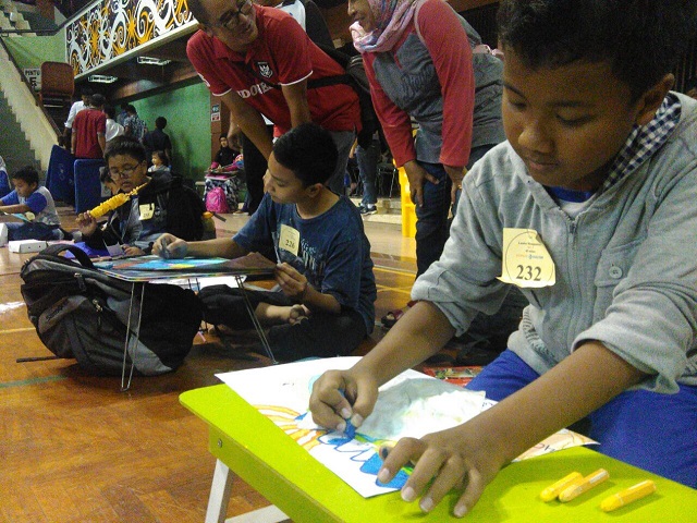 Para peserta lomba tengah asik menuangkan kreativitasnya dalam seni mewarnai gambar.