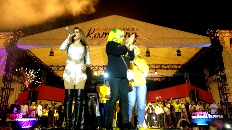 Artis dangdut ibukota Nita Thalia (kiri) menghibur masyarakat Bone di malam tahun baru 2018.