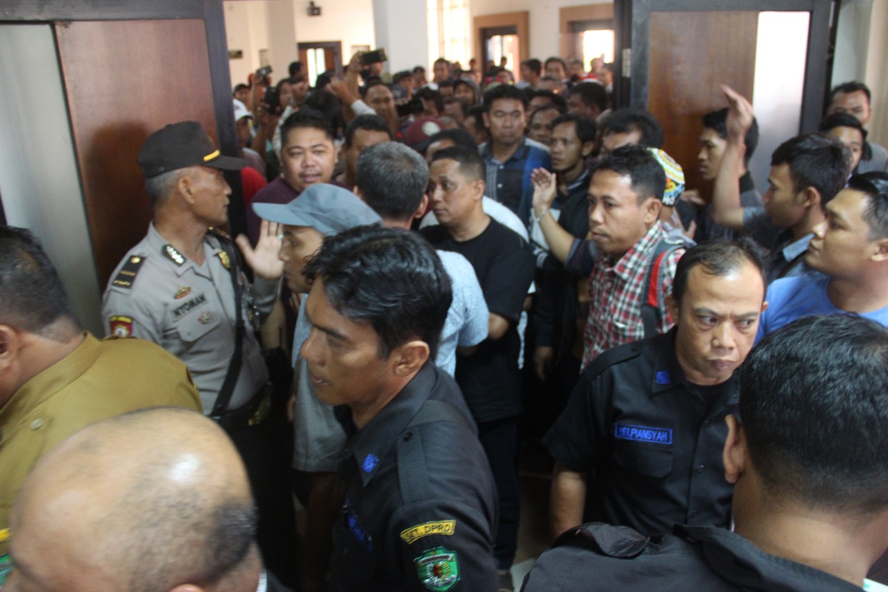 Ratusan sopir yang beroperasi di Bandara Sultan Aji Muhammad Sulaiman Sepinggan memaksa masuk di Ruang Rapat Gedung E DPRD Kaltim. (EKSPOSKaltim/Muslim)