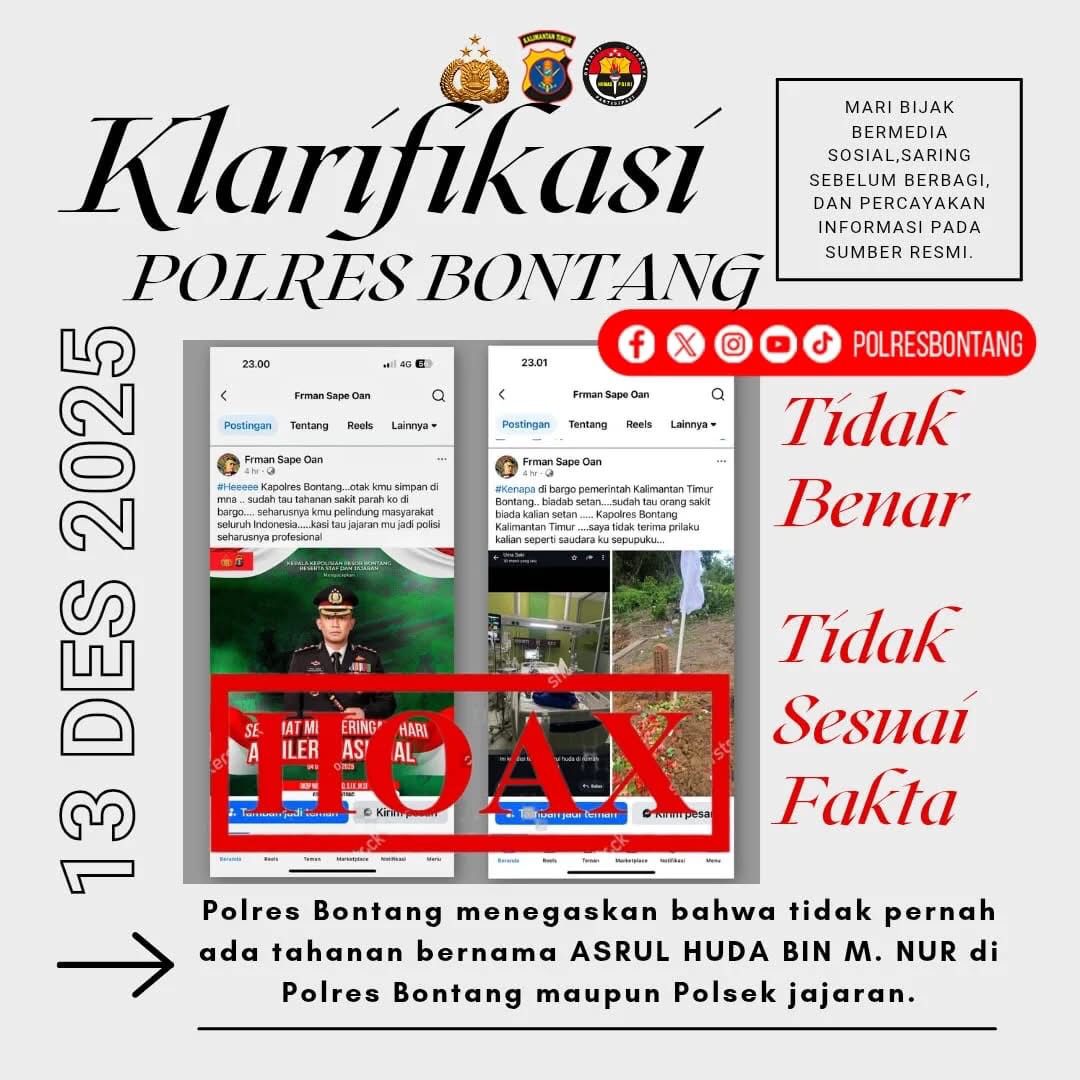 “Perlu kami tegaskan bahwa Polres Bontang tidak pernah memiliki atau menahan seseorang bernama Asrul Huda bin M Nur seperti yang dituduhkan dalam unggahan di media sosial. Dengan demikian, narasi yang beredar adalah tidak berdasar dan menyesatkan."