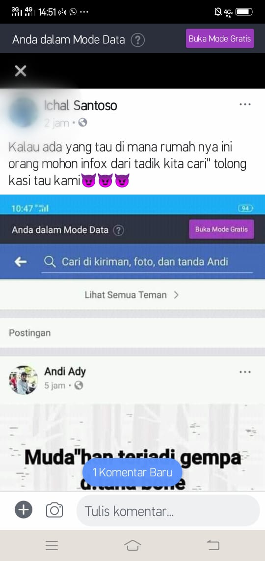 “Kalau ada yang tau di mana rumah nya ini orang mohon infox dari tadik kita cari” tolong kasi tau kami,” tulis akun Ichal Santoso yang mengunggah secreenshot postingan Andi Ady.