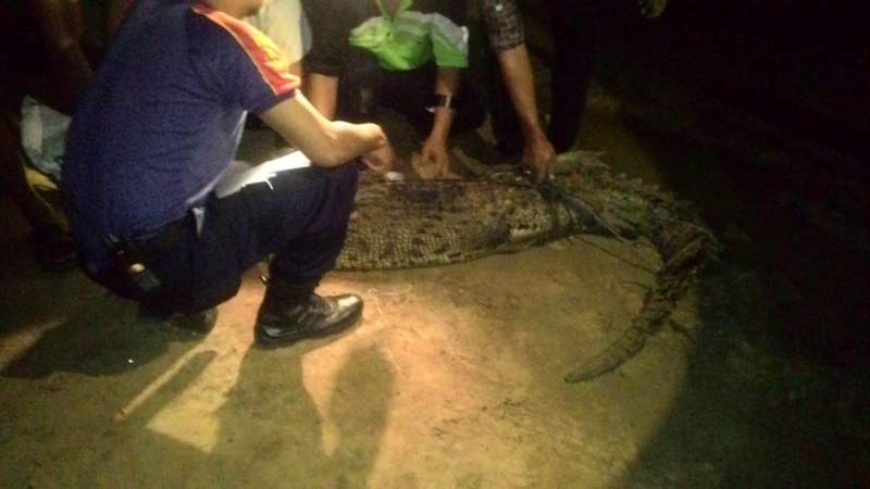 salah seorang warga mengatakan, buaya tersebut pertama kali ditemukan oleh warga bernama Agus. Agus yang hendak pulang kerumahnya, dikagetkan dengan keberadaan seekor buaya pas didepan rumahnya.