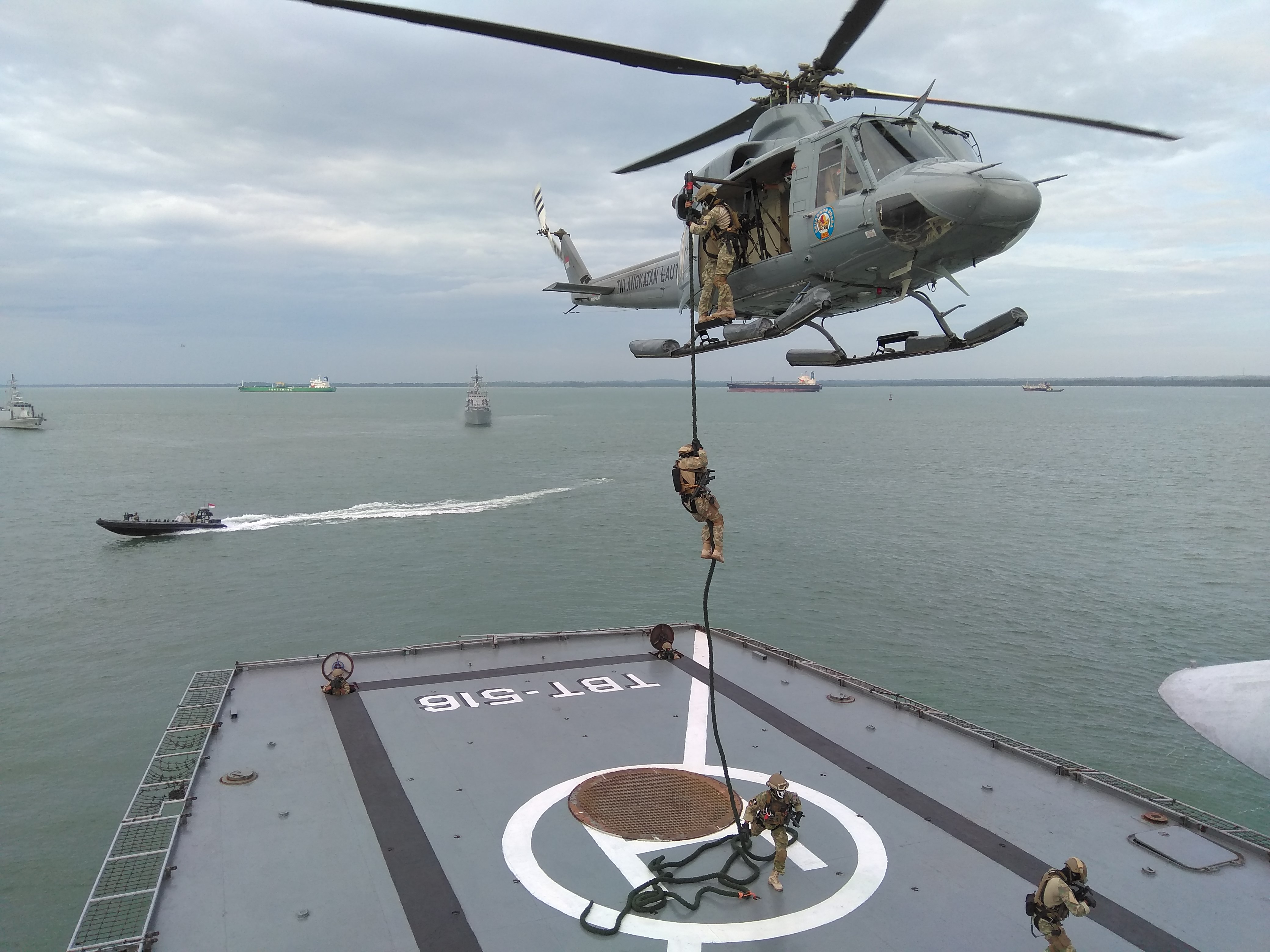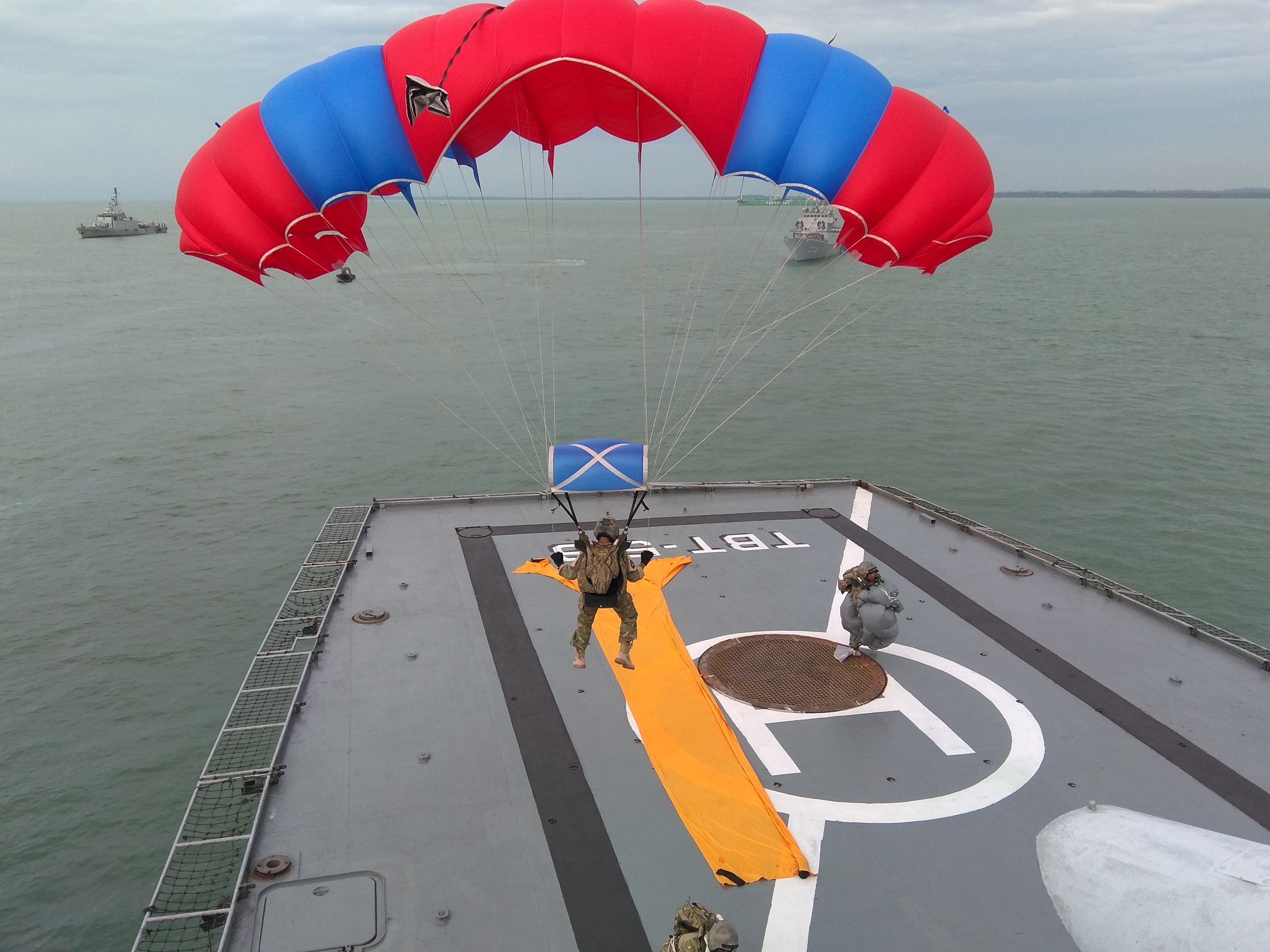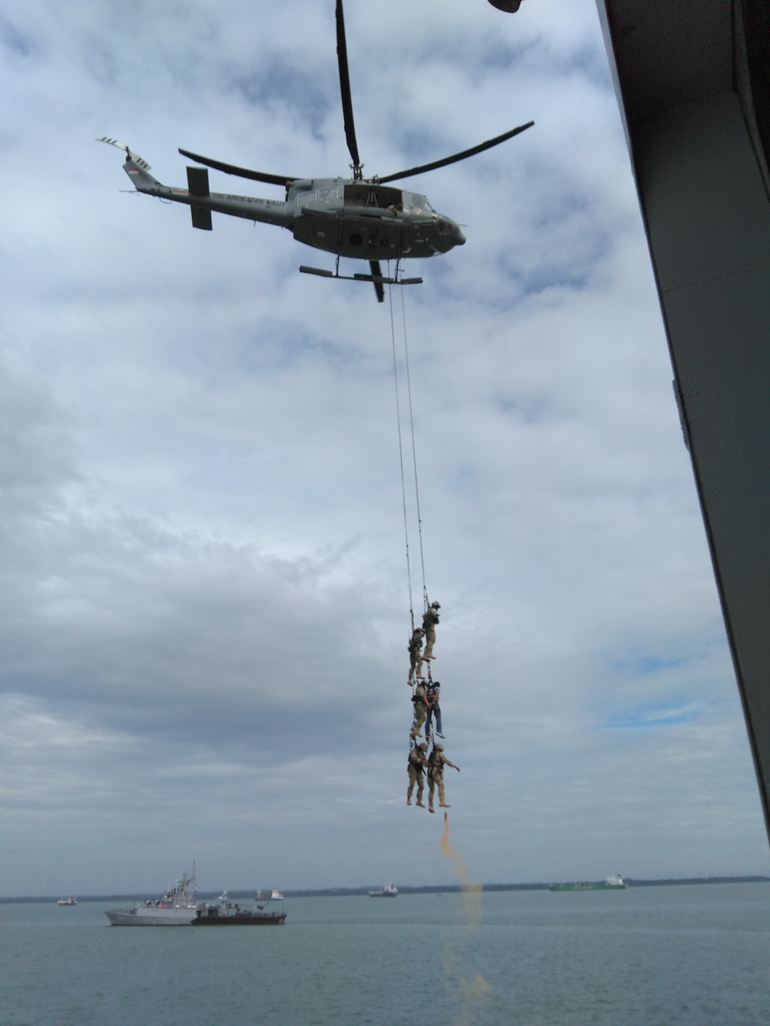 Sebelumnya 5 personel Kopaska juga diturunkan melalui Heli BO HU-420 dengan teknis fast roping atau terjun menggunakan tali.