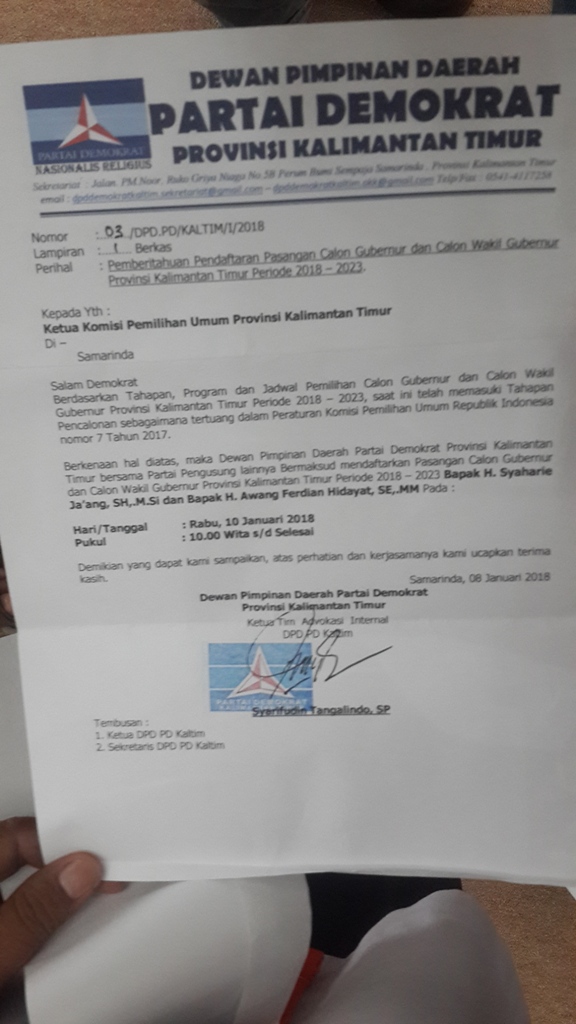 Dalam surat tersebut, memberitahukan bahwa DPD Partai Demokrat dan partai pengusung lainnya bermaksud mendaftarkan paslon Syaharie Jaang dan Awang Ferdian Hidayat, yang ditandatangani oleh Ketua tim Advokasi Internal DPD PD Kaltim, Syarifudin Tangalindo.