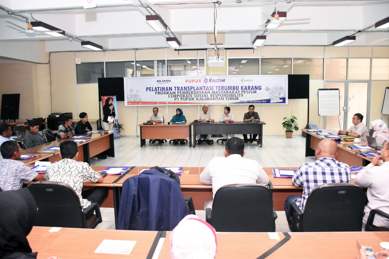 EKSPOSKALTIM.com, Bontang - Terus menunjukkan kepeduliannya terhadap ekosistem laut, Pupuk Kaltim menggelar "Pelatihan Transplantasi Terumbu Karang " yang merupakan program pemberdayaan masyarakat pesisir melalui Corporate Sosial Responsibility (CSR)nya. Kegiatan diselenggarakan di Aula Gedung Diklat Kantor Pusat Pupuk Kaltim, Kamis (27/9/2018).