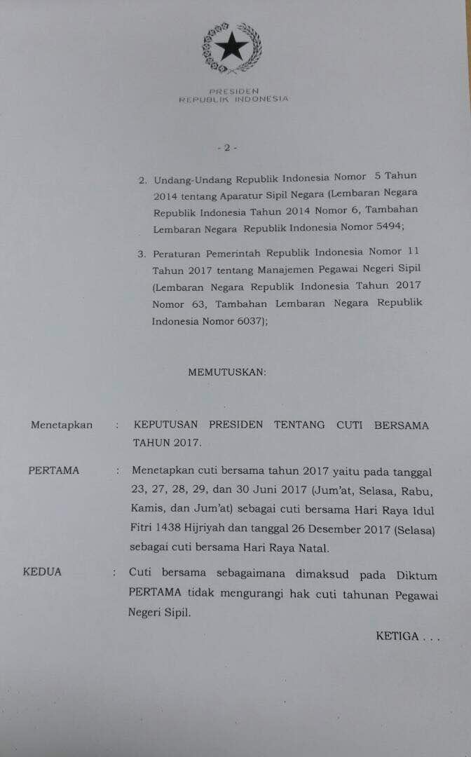 Dalam Keppres ini, disebutkan bahwa tanggal 23, 27, 28, 29, dan 30 Juni 2017 (Jumat, Selasa, Rabu, Kamis dan Jumat) sebagai cuti bersama Hari Raya Idul Fitri 1438 Hijriyah dan tanggal 26 Desember 2017 (Selasa) sebagai cuti bersama Hari Raya Natal.
