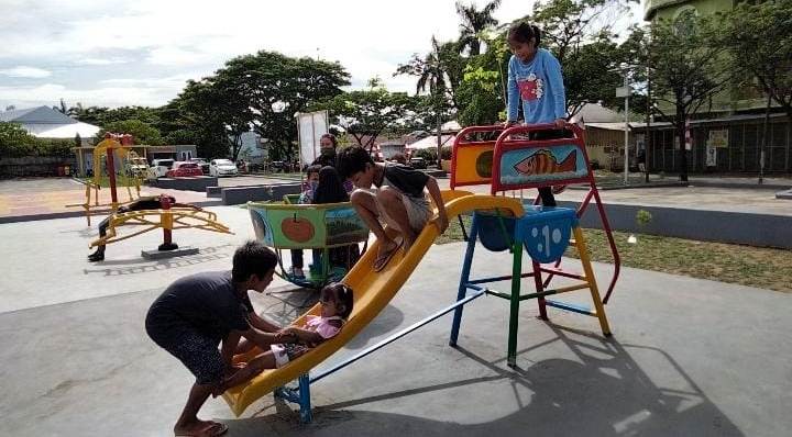 Anak-anak tengah asyik bermain pada wahana yang ada di Watampone Green Epicentrum, Kabupaten Bone.