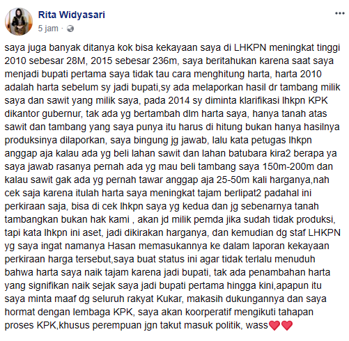 Dalam status itu Rita bermaksud menjelaskan agar masyarakat tidak terlalu menuduh bahwa harta yang naik tajam setelah ia menjabat bupati.