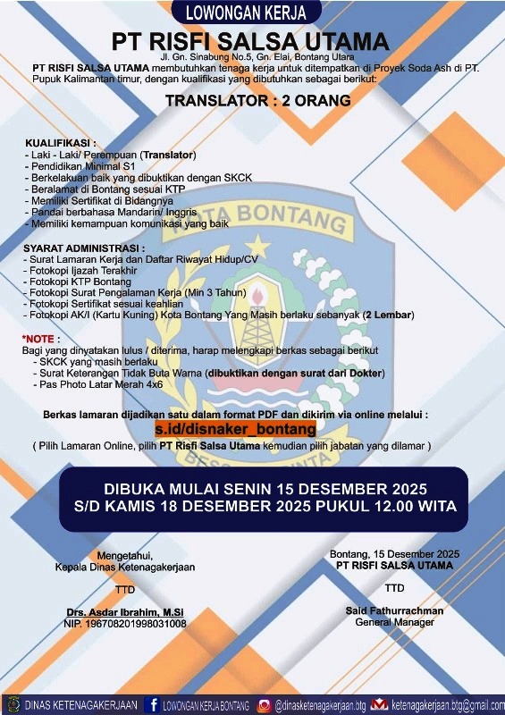 PT Risfi Salsa Utama buka lowongan Translator di Bontang. Syarat: S1, bahasa Mandarin/Inggris. Daftar online 15-18 Desember 2025 pukul 12.00 WITA.