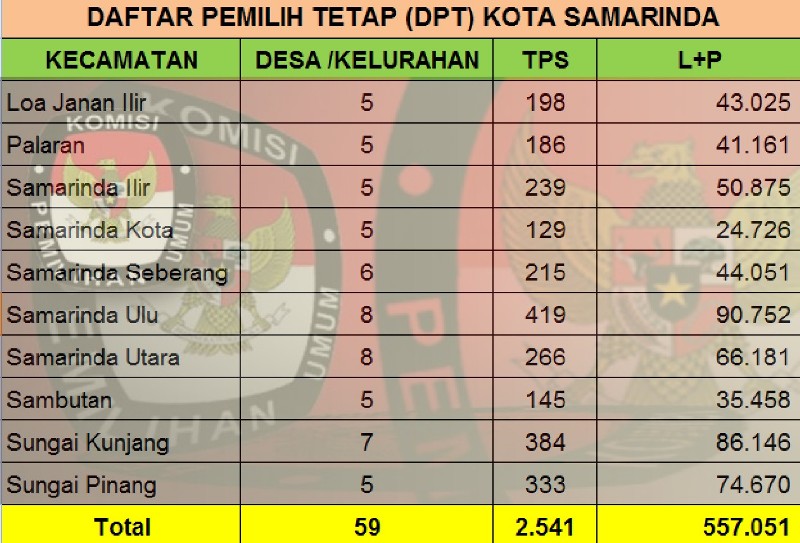 Dimana total DPT keseluruhan berdasarkan hasil pleno KPUD Samarinda sebanyak 557.051 untuk Pileg dan Pilpres. Sebelumnya DPT Pilgub Kaltim 2018 ada 549. 626 DPT.