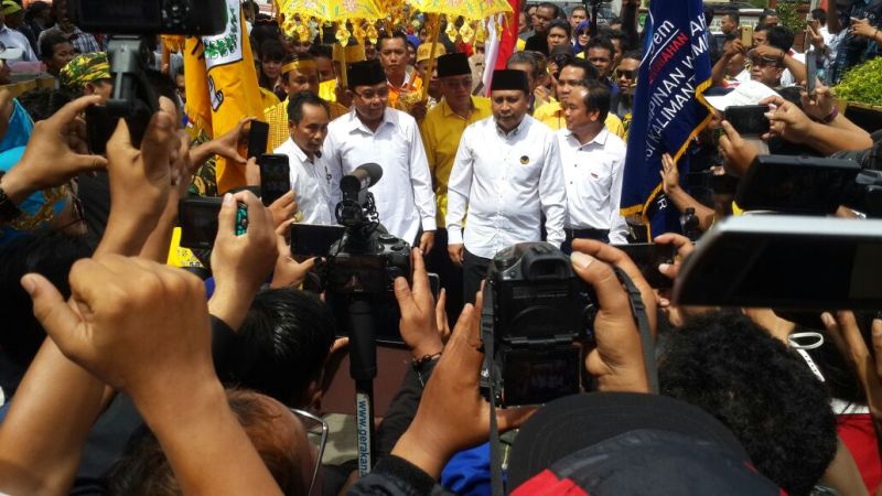 EKSPOSKALTIM, Samarinda - Pasangan bakal calon Gubernur dan Wakil Gubernur Kaltim, Andi Sofyan Hasdam dan Nusyirwan Ismail resmi mendaftar ke KPU Kaltim. Pasangan calon (paslon) yang diusung partai Golkar - Nasdem ini, merupakan peserta kedua yang mendaftar untuk mengikuti kontestasi Pilgub Kaltim 2018-2023, Samarinda, Rabu (10/1/2018) siang.