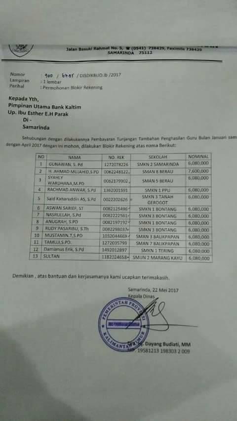 Disdik Kaltim melalui surat yang ditandatangani Kadisdik Dayang Budiati dengan nomor 900/6795/DISDIKBUD.ib/2017 memblokir rekening 13 guru perwakilan yang diterima untuk berdialog dengan pemprov.