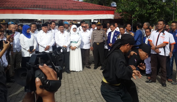 Menggunakan baju putih dan kopiah hitam, Isran - Hadi disambut tarian silat dan sorak sorai dari para simpatisan dan relawan yang telah menunggu sejak pagi di Kantor KPU. Turut menemani Noorbaiti, istri dari Isran Noor dan Erni Makmur, istri Hadi Mulyadi.