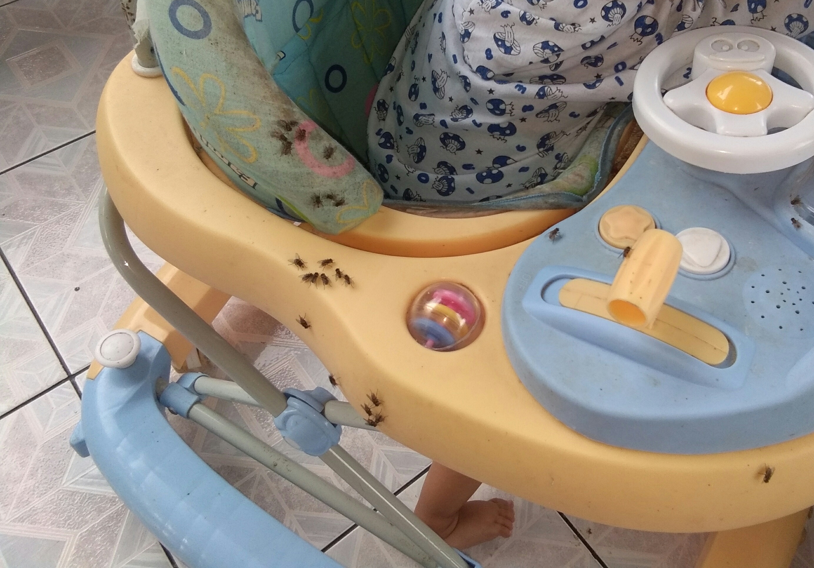 Kerumunan lalat hinggap di kereta bayi milik seorang warga Bajoe yang rumahnya tak jauh dari kandang ayam.